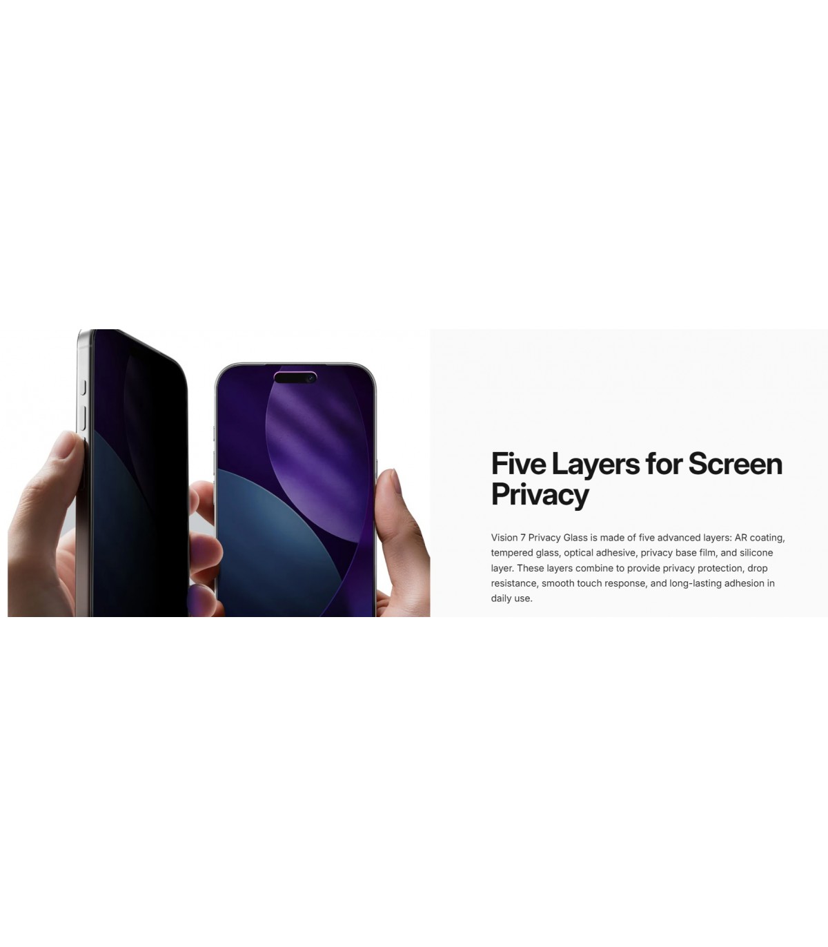 - Five-Layer Protection Structure : includes an AR coating, tempered glass, optical adhesive, privacy base film, and silicone layer offering impact resistance, lasting adhesion, and a smooth touch experience.